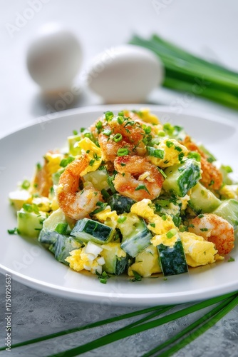 Keto salad with shrimp, avocado, egg, and cucumber on a light background