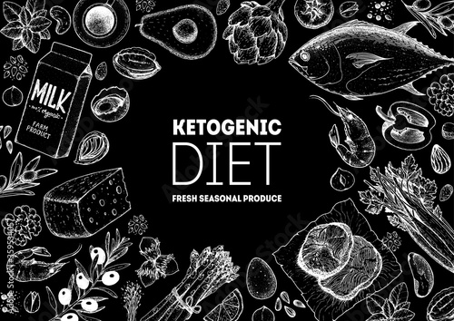 Ketogenic diet sketch. Food illustration. Hand drawn vector illustration. Organic food diet. Good food illustration. Design elements. Hand drawn sketch. Various food frame. Organic food store concept.