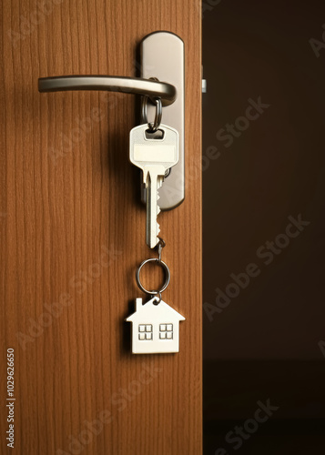 Key and home shaped keychain on open door. Mortgage, investment, real estate, property new home concept