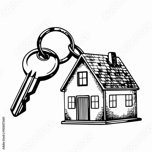 Key and House Illustration Symbolizing Home Ownership and Security in Black and White Design