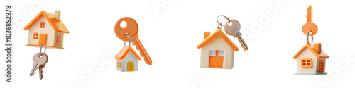 Keychains and house-shaped accessories symbolize home ownership and keys, representing security and belonging on transparent background.