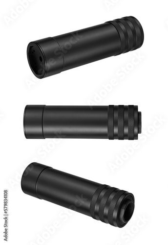 Khaki green silencer for weapons. Suppressor that is at the end of an assault rifle. Isolate on a white back.