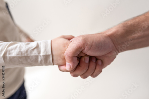 Kid and parent handshake. Relationship and friendship between children and adult in family conception on white background