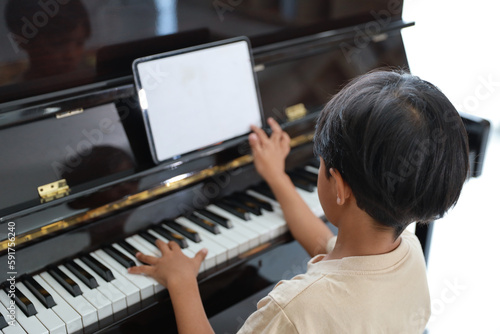 Kid asian black hair boy sitting and playing piano with tablet in living room house indoor. Musical and relaxation makes them happiness. Health care lifestyle concept.