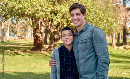 Kid, boy and hug father in park with love, support and happy for reunion or play outdoor. Family, dad and child bonding together in portrait for security, care and childhood with growth in nature