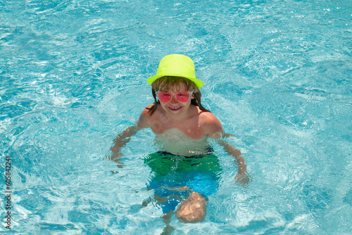 Kid boy relaxing in pool. Child swimming in water pool. Summer kids activity. Fashion summer child boy in summer hat and pink sunglasses.