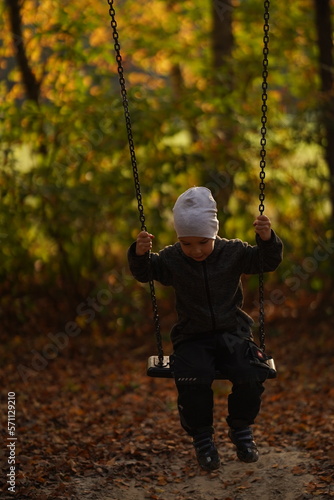 Kid bungee jumping in the summer forest