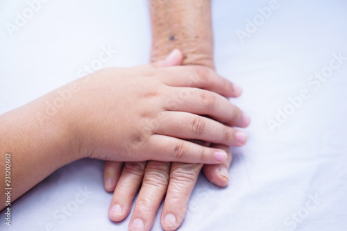 Kid children holding Touching hands Asian senior or elderly old lady woman patient with love, care, helping, encourage and empathy at nursing hospital ward : healthy strong medical concept