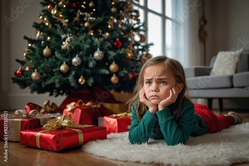 Kid in bad mood, waiting or disappointed, kid girl in living room with christmas tree
