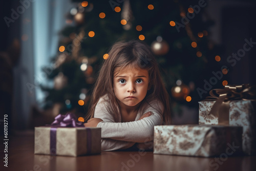 kid in bad mood, waiting or disappointed, kid girl in living room with christmas tree. Generative AI