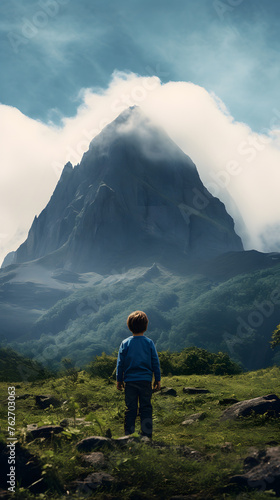 Kid looking up a massive mountain, kid looking up a mountain