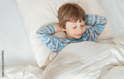 Kid on sleeping bed, happy bedtime in white bedroom