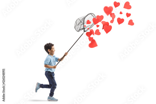 Kid running and catching hearts with a net