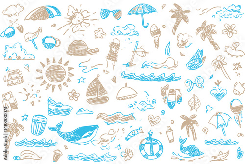 Kid Summer Beach Crayon Background Doodle Sea Sun Cloud Wave Palm Whale Umbrella Boat Hand Drawn Vector