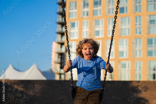 Kid swinging on swing in city park. Childhood, Freedom, Happy, Summer Outdoor. Cute child boy playing on swing, having fun. Blonde cute kid having fun on a swing in playground kids.