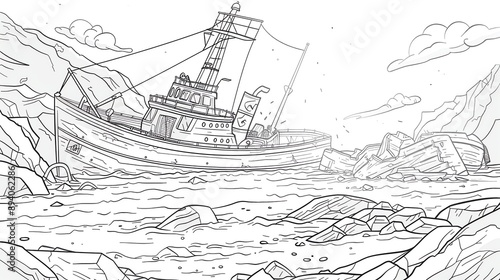 kids coloring book pageGroupers near a shipwreckheavy line art, clean line art, simple, only line