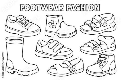 Kids' Footwear Coloring. Footwear fashion children?s coloring book illustration, outlined drawing, cheerful