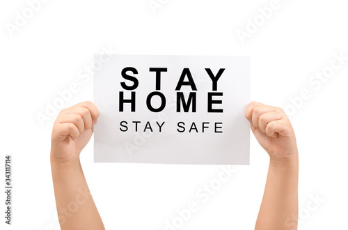 Kid's hands holding Stay home, stay safe message on paper isolated