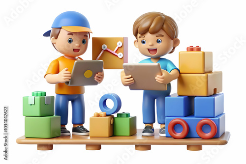 Kids Operating a Toy Supply Chain: Smart Kids Simulating Supply Chain Management with Charts and Toys, Showcasing Analytical Skills and Cooperation in a Glossy Close-Up Scene