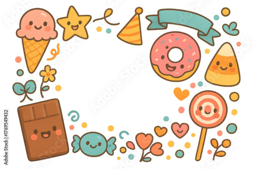 Kids party frame with cute happy desserts characters, candy, ice cream, donut, chocolate bar, and sweets on transparent background