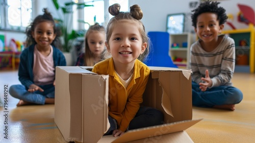 Kids playing with a cardboard box, imagining it's a spaceship.