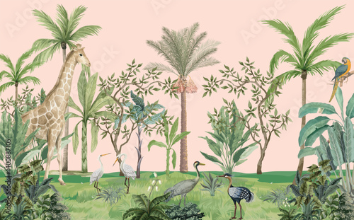 Kids Safari, Jung Wall Mural, Animals, Tropical Tree, Watercolor Background.