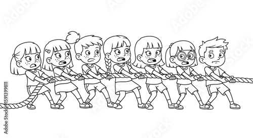 Kids Tug of War Illustration: A playful illustration of children engaged in a lively tug-of-war, showcasing teamwork, competition, and childhood fun.