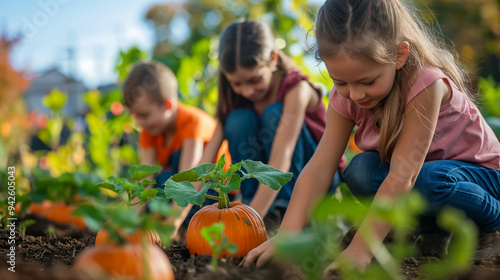 Kids with Pumpkins in the School Garden: Kids growing pumpkins in the school garden, tending to the plants and learning about the life cycle of pumpkins, with copy space