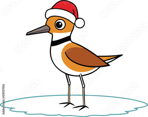 Killdeer bird wearing Santa cap standing on snowy ground festive Christmas wildlife winter holiday season nature outdoors