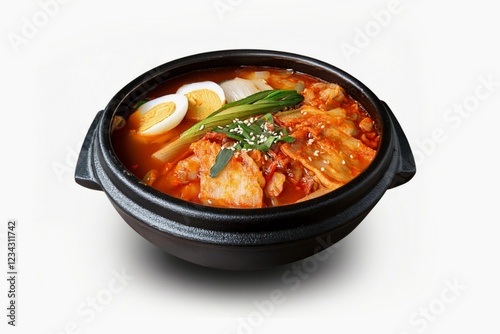 Kimchi Jjigae served in a black clay pot isolated on white background with clapping path full of depth