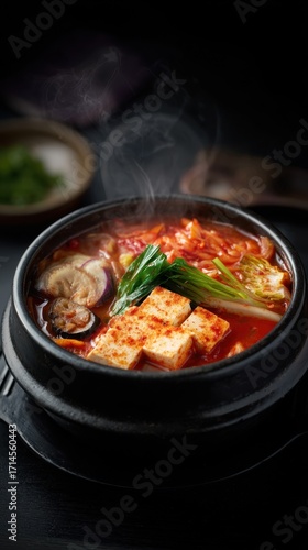 Kimchi Soup with Tofu in a Black Bowl