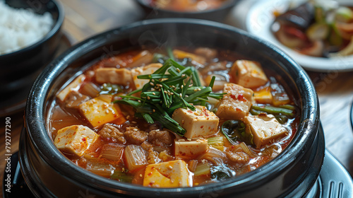 Kimchi stew with tofu, pork and various vegetables. Generative AI.