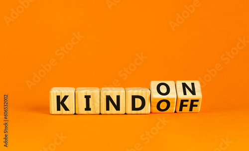 Kind on or off symbol. Businessman turns wooden cubes and changes word Kind off to Kind on. Beautiful orange table orange background. Business and kind on or off concept. Copy space.