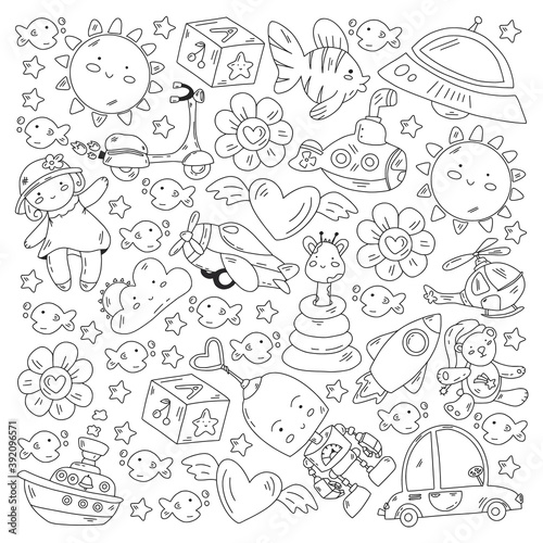 Kindergarten, toys vector pattern. Little children creativity and imagination. Online education, educational games.