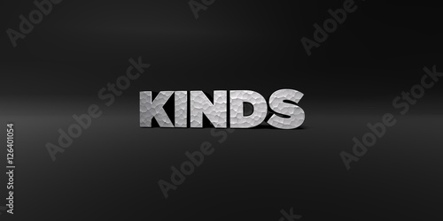 KINDS - hammered metal finish text on black studio - 3D rendered royalty free stock photo. This image can be used for an online website banner ad or a print postcard.