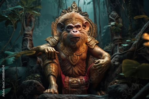 King monkey in the jungle or forest with powerful angry look. Hindu or hinduims monkey god concept representation. Dominating primate chimp character. Ai generated