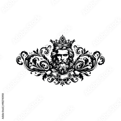 king with victorian flourish decoration in black and white illustrations, cutout graphic