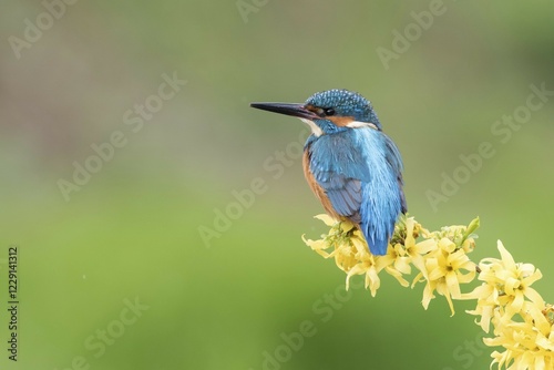 Kingfisher (Alcedo atthis) on forsythia branch, Hesse, Germany, Europe