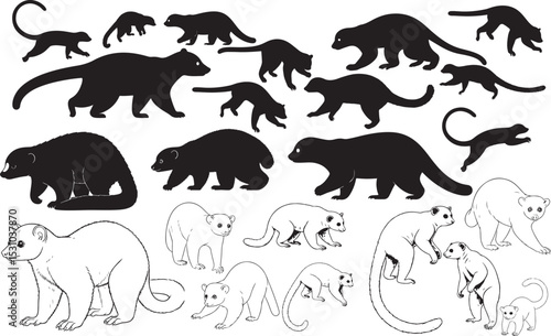 Kinkajou Silhouettes – Solid Black & Outline Vector Set