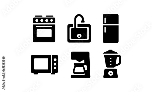 Kitchen appliance icons: stove, refrigerator, blender, more in solid style