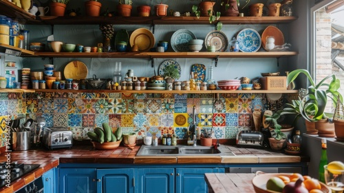 kitchen combines open shelving, colorful tiles, and a mix of vintage and modern elements,