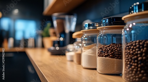 Kitchen countertop with coffee beans, sugar, flour. Lifestyle background