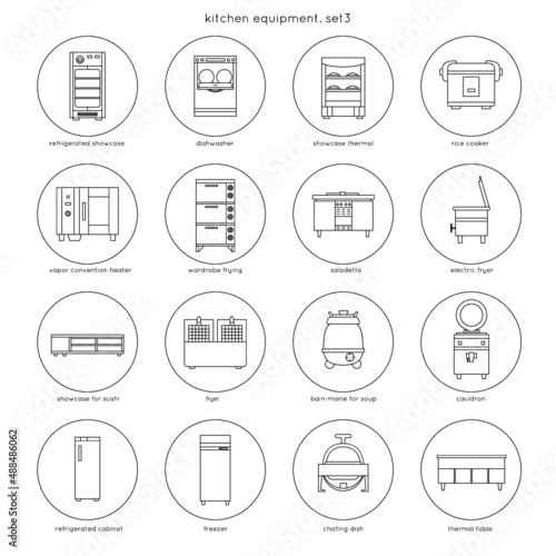 Kitchen equipment for restaurants and cafes: refrigerated showcase, dishwasher, rice cooker, fryer, bain-marie for soup, cauldron, chafing dish, freezer. Set 3. Linear round icons.