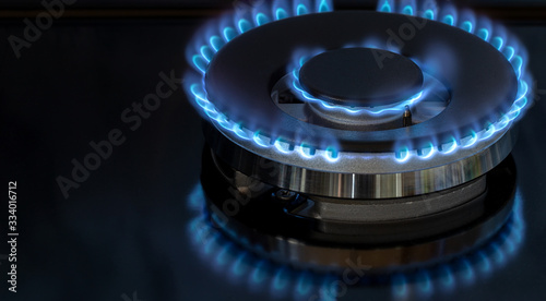 Kitchen gas stove burner with blue flames on black background.