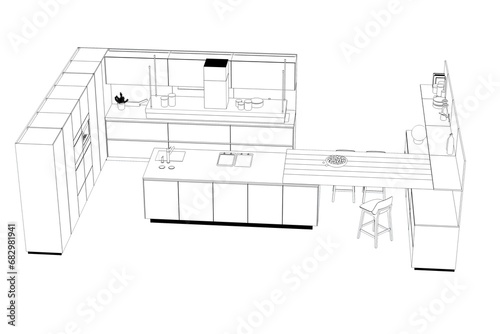 Kitchen interior furniture isolated on a white background, outline illustration, sketch