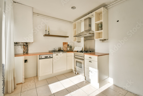 Kitchen interior with cabinets and appliances