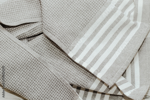 Kitchen modern textile towel on kitchen wooden table.