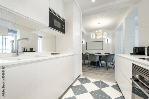 Kitchen of minimalist design with smooth white wood furniture and combined floors of porcelain and light flooring