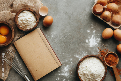 Kitchen scene shows preparation with baking tools and flour
