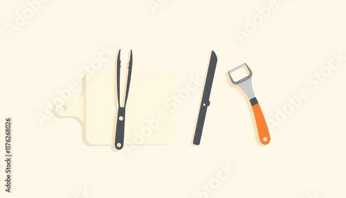 Kitchen Tools Icon Set. Flat icons of kitchen essentials: chopping board, tongs, and peeler.